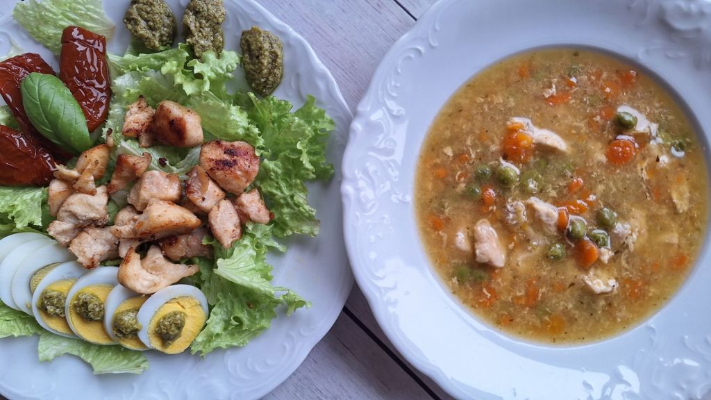 LCHF: solata s popečenim piščančjim mesom, sušenim paradižnikom, kuhano jajce, pestom genoveze