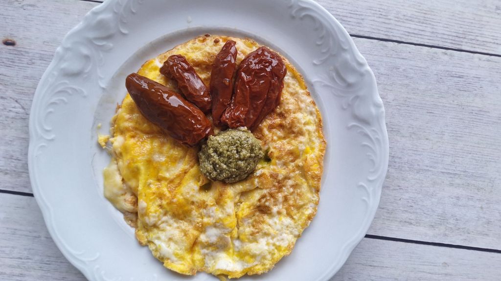 LCHF: jajčna omleta, sušen paradižnik z pestom