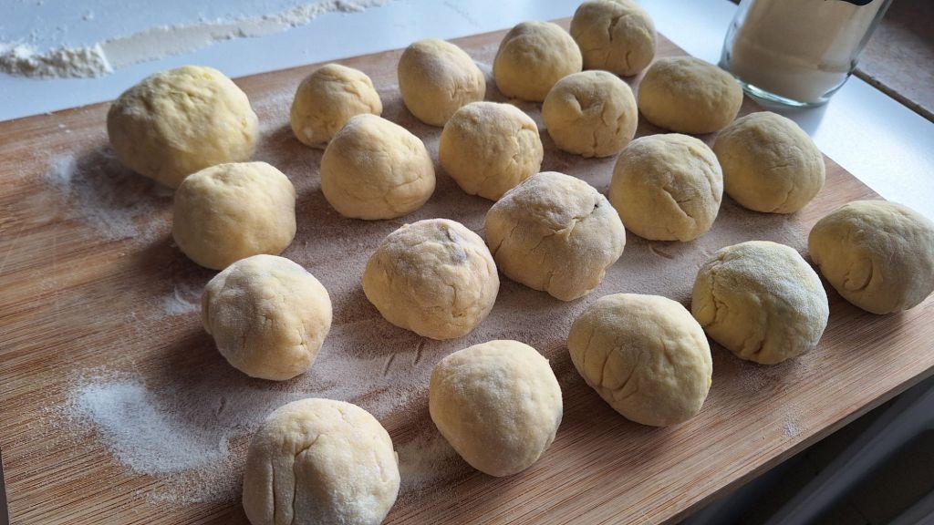 Testo za njoke sem razvajala, razrezala in na vsak košček dala žličko čokoladnega namaza (veganski), naredila kroglice in jih skuhala v slani vodi. Na koncu pa sem jih povaljala še po drobtinicah. Baje so bili odlični.