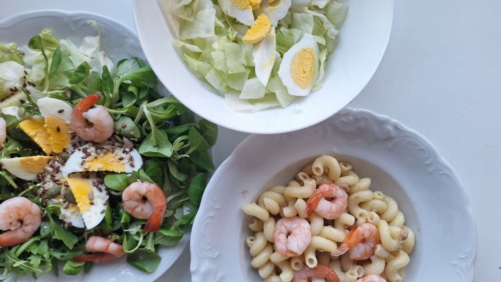 LCHF: mešana solata, jajčka, kozice