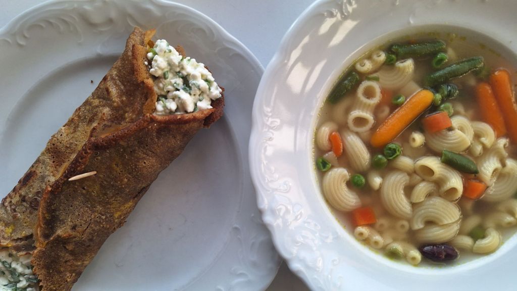 LCHF: palaÄŤinka iz zelene bananine moke speÄŤena na jajÄŤki, polnjena z zrnatim sirom in drobnjakom
