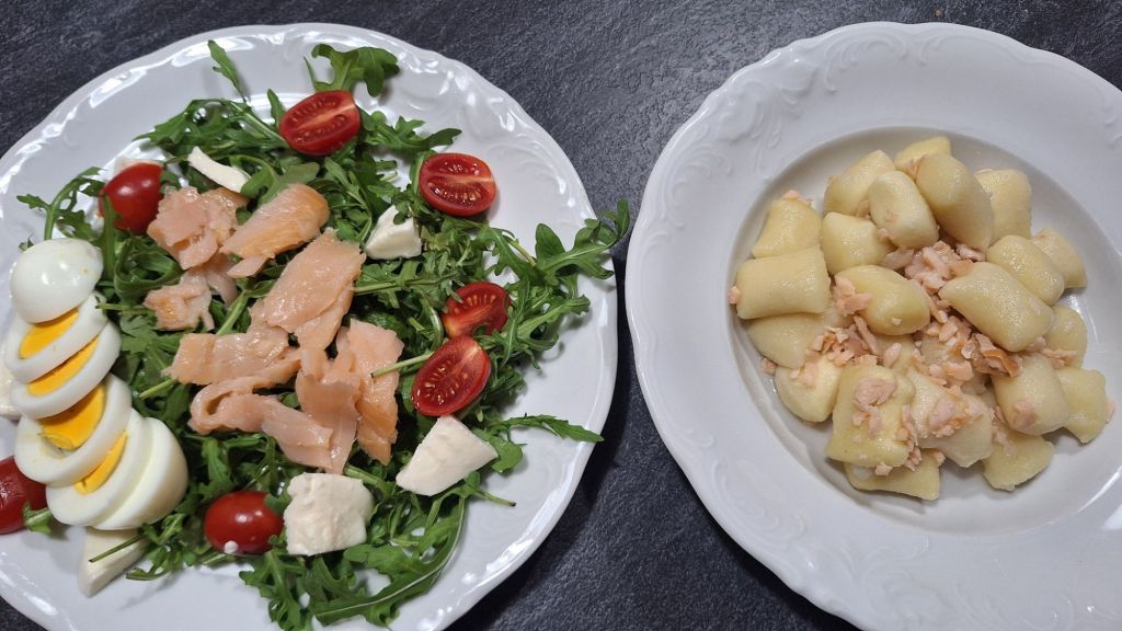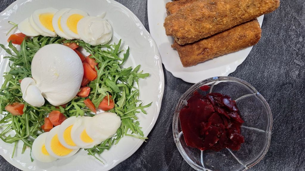 LCHF: rukola, losos, paradižnik, jajce, mocarela