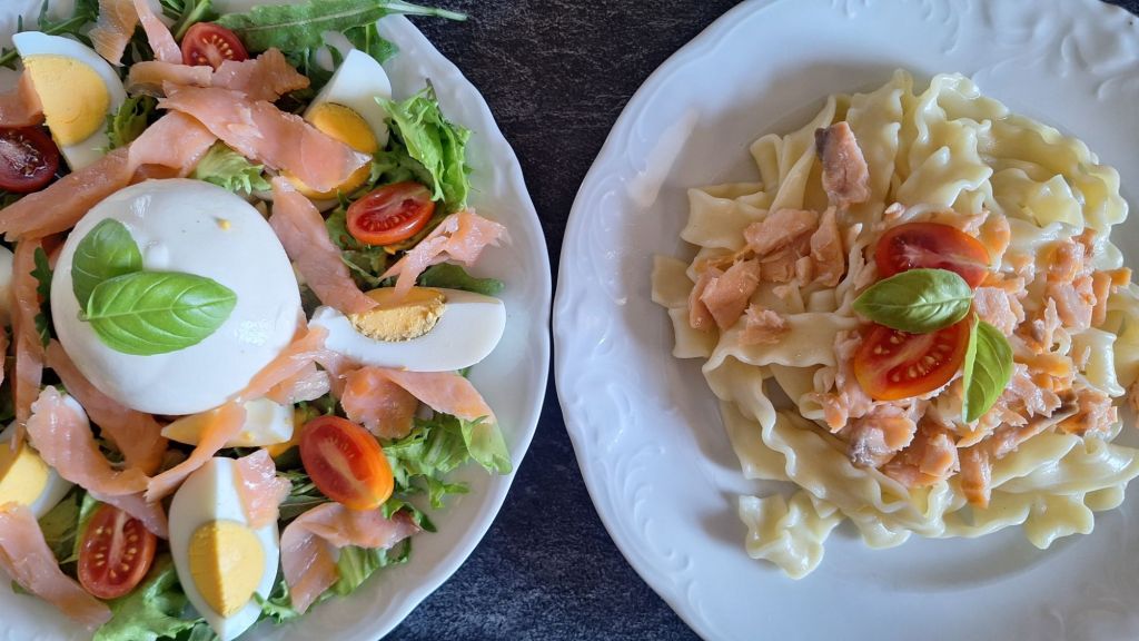 LCHF: endivja, rukola, losos, jajčka, burata, češnjev paradižnik