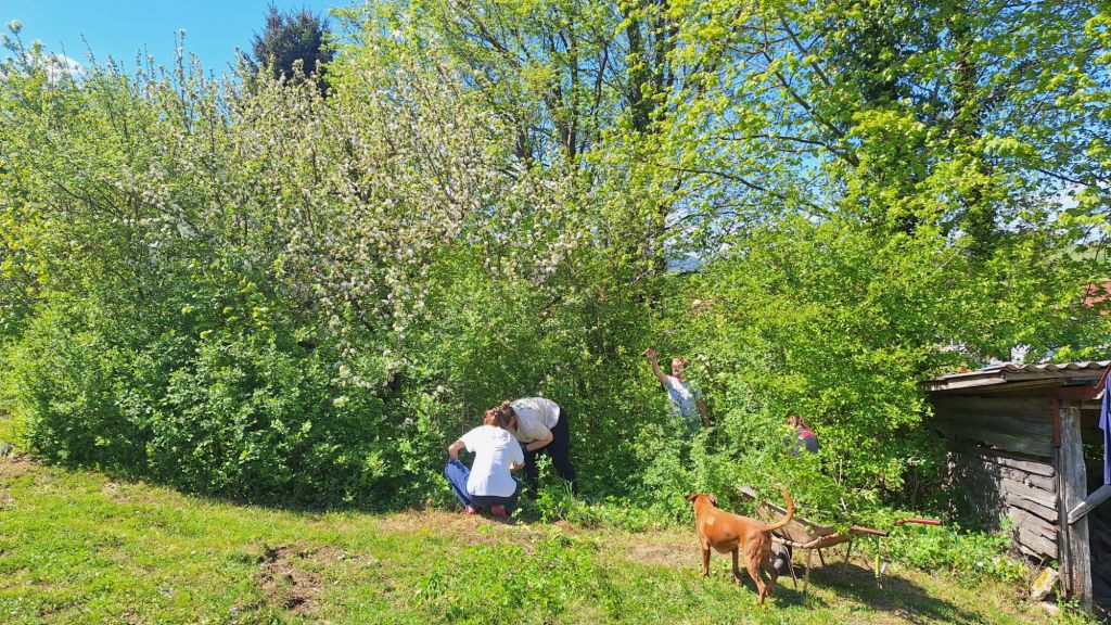Otroci so bili odjavljeni od kosila, zato so hodili domov na kosilo. Popoldan pa smo šli na hiško, kjer smo v nedeljo imeli delovno akcijo (svakinja z družino in prijateljica). Za hrano in pavlovo torto je poskrbela svakinja. Lotili smo se zaraščenih delovno parcele. Matej je na hiški odprl podstrešje, da bo dal izolacijo.